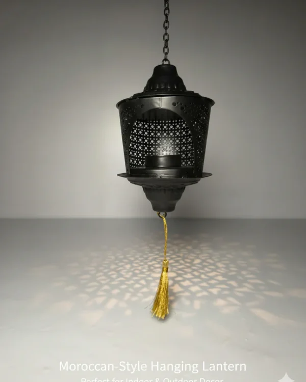 Moroccan-Style Hanging Lantern – Black Metal Lamp with Golden Tassel for Indoor & Outdoor Decor