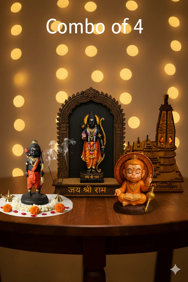 Ultimate Ram Darbar (Ram Lalla, Ram Murti, Ram Mandir with Light & Hanuman Ji Divine Combo Set of 4)