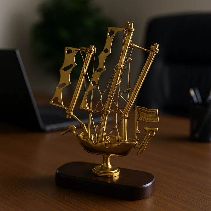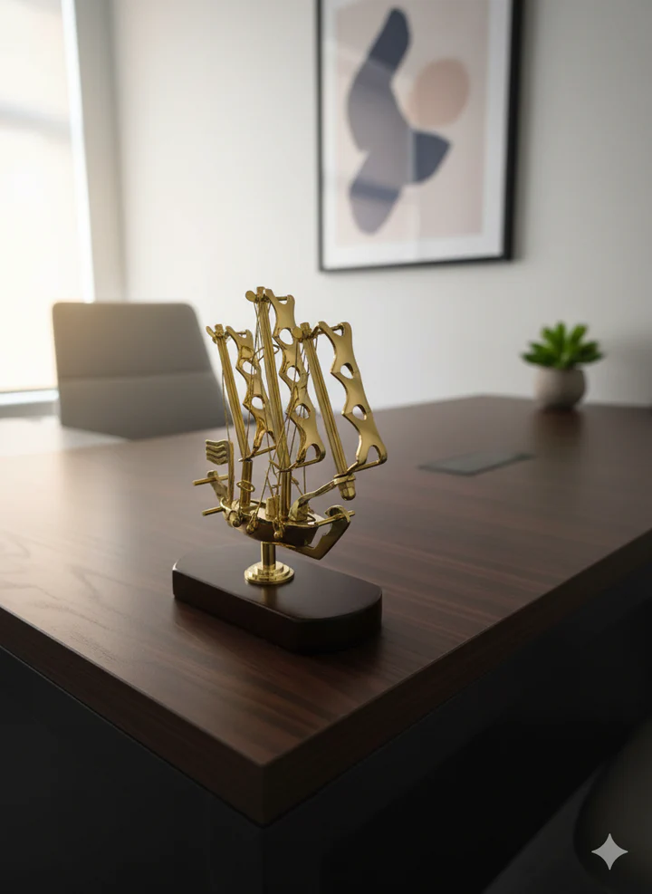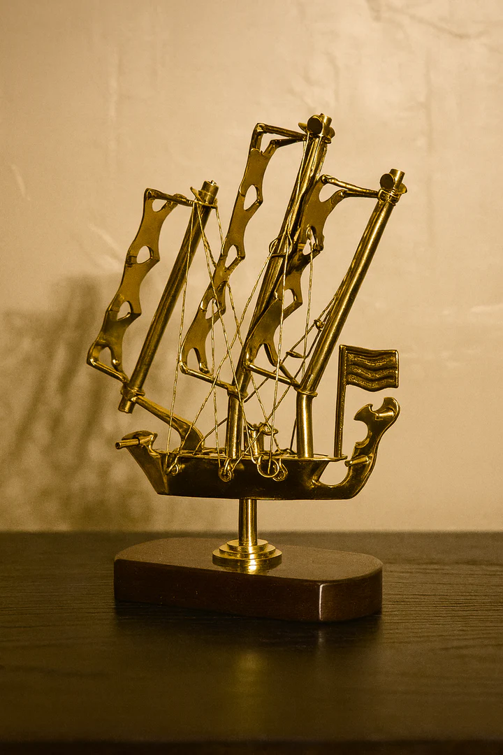 Vintage Brass Ship Showpiece with Wooden Base – Nautical Home & Office Decor